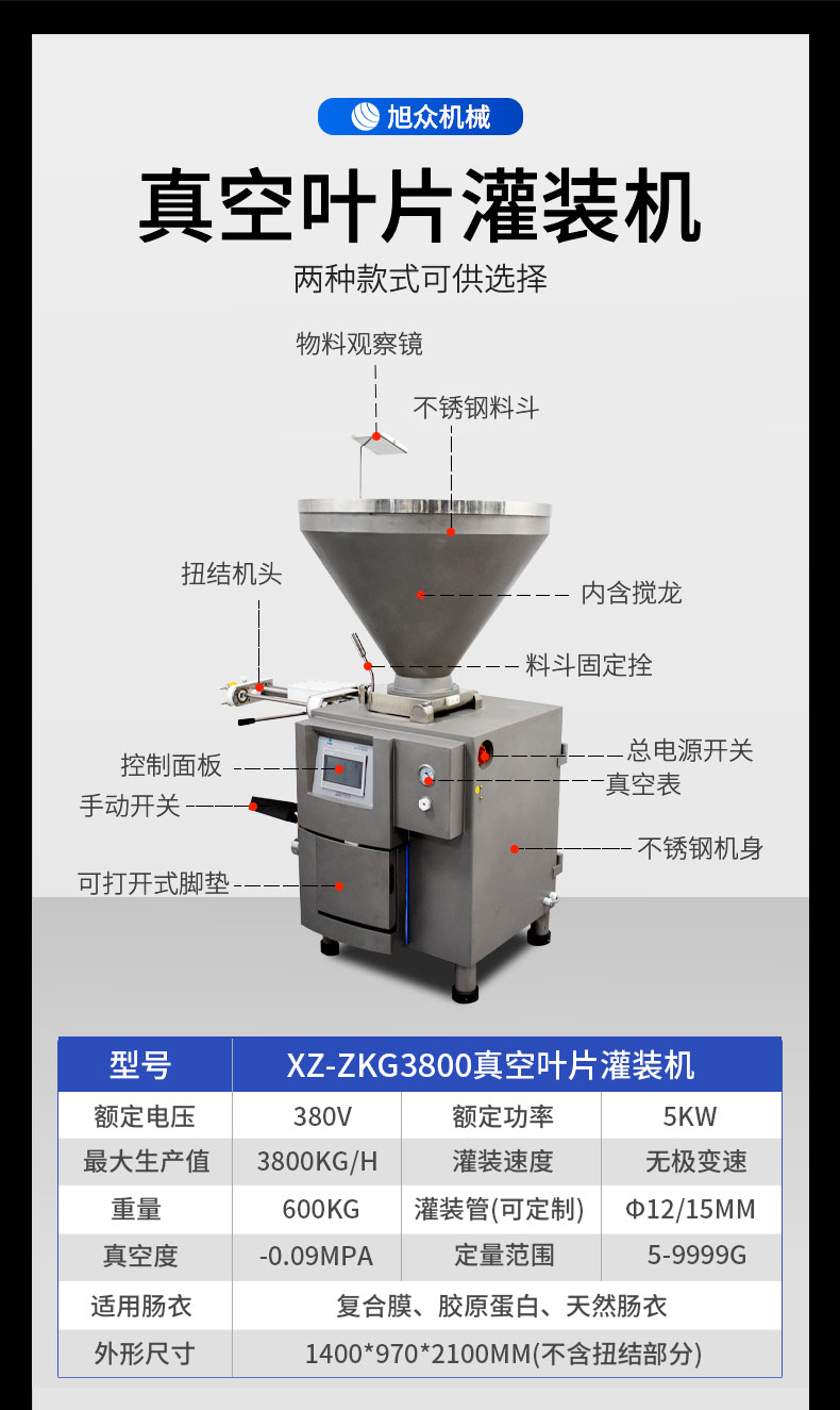 名稱XZ-ZKG3800真空葉片灌裝機 電源380v 功率5kw 產(chǎn)量最大值3800kg/h 尺寸1400*970*2100mm(不含扭結部分) 重量600kg 規(guī)格5-10000g 其他